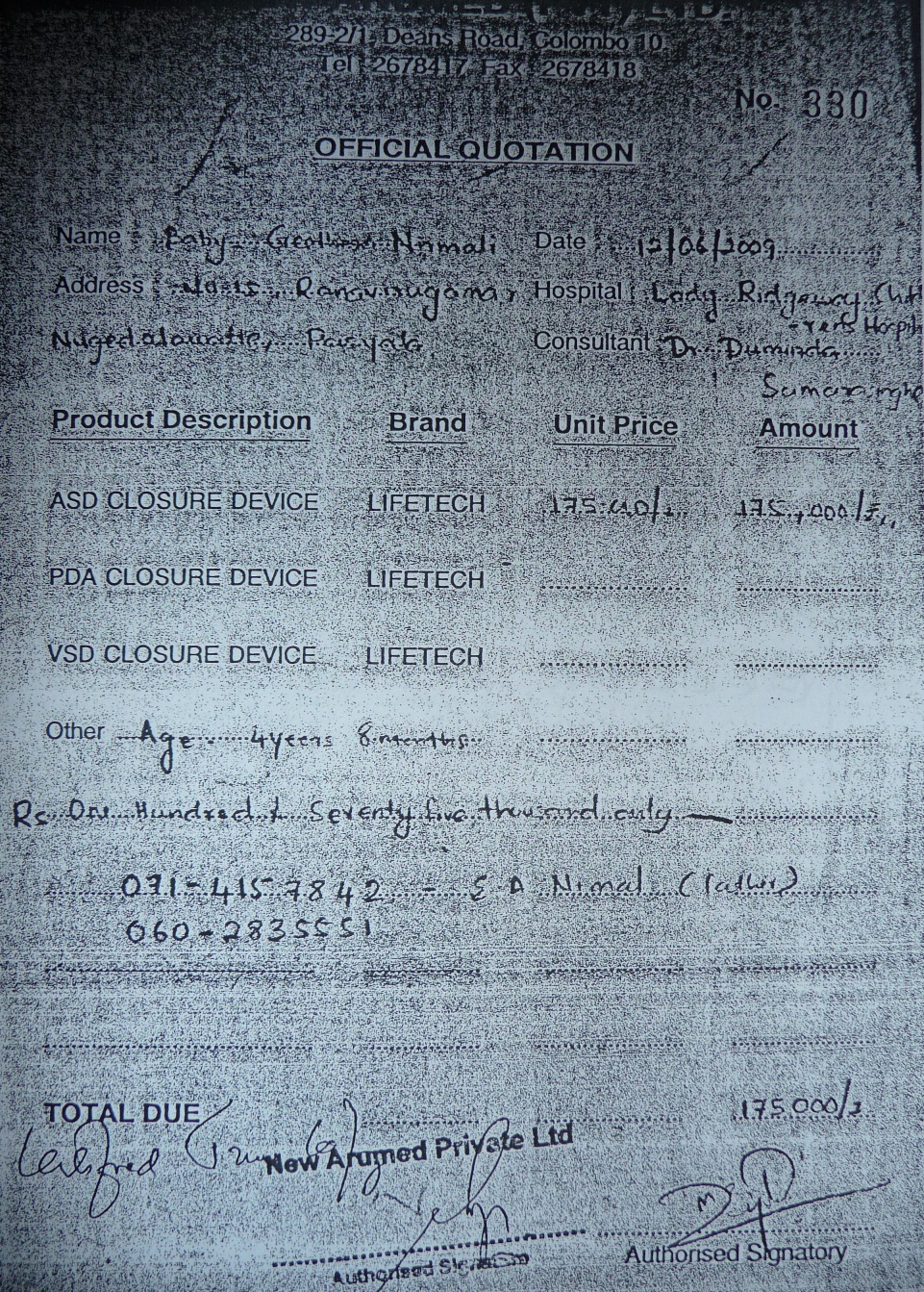 Hole in the heart. Needs a Lifetech ASD device. The surgery will be performed free of charge at the Lady Ridgeway Hospital (Colombo) if the patient can provide the device. The cost of the device is Rs.175,000.00 |