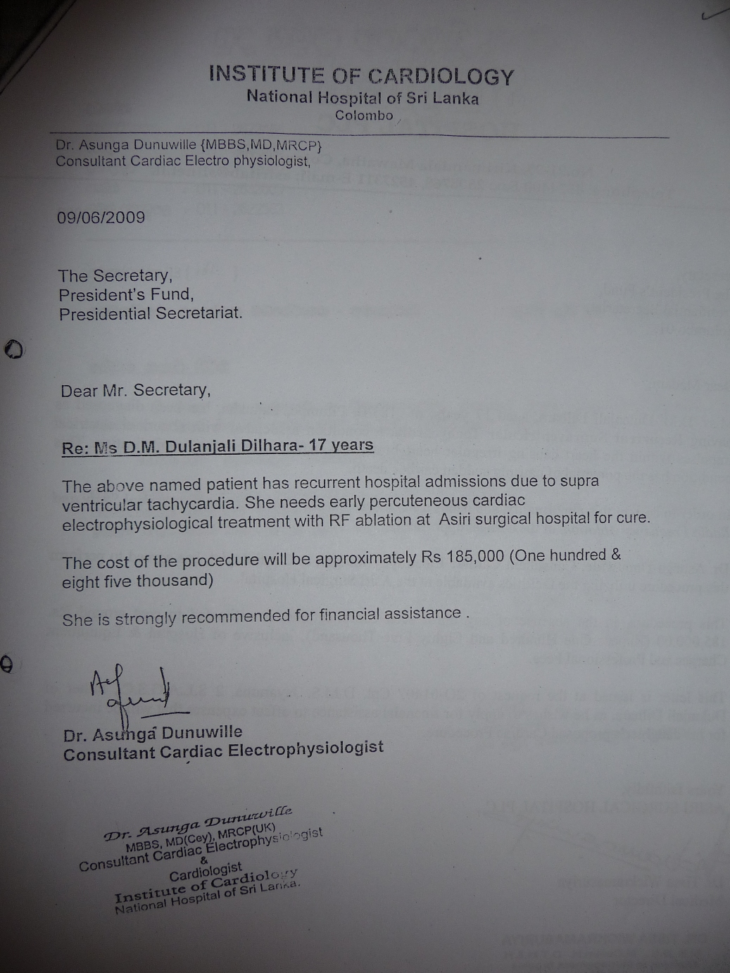Dulanjali Dilhara is daughter of Lance Corporal Jayarathna of SL Army. Dulanjali is suffering from a serious heart disorder. In order to correct this abnormality, she needed early percurneous cardiac electrophysiological treatment with RF ablation at Asiri surgical hospital for cure.