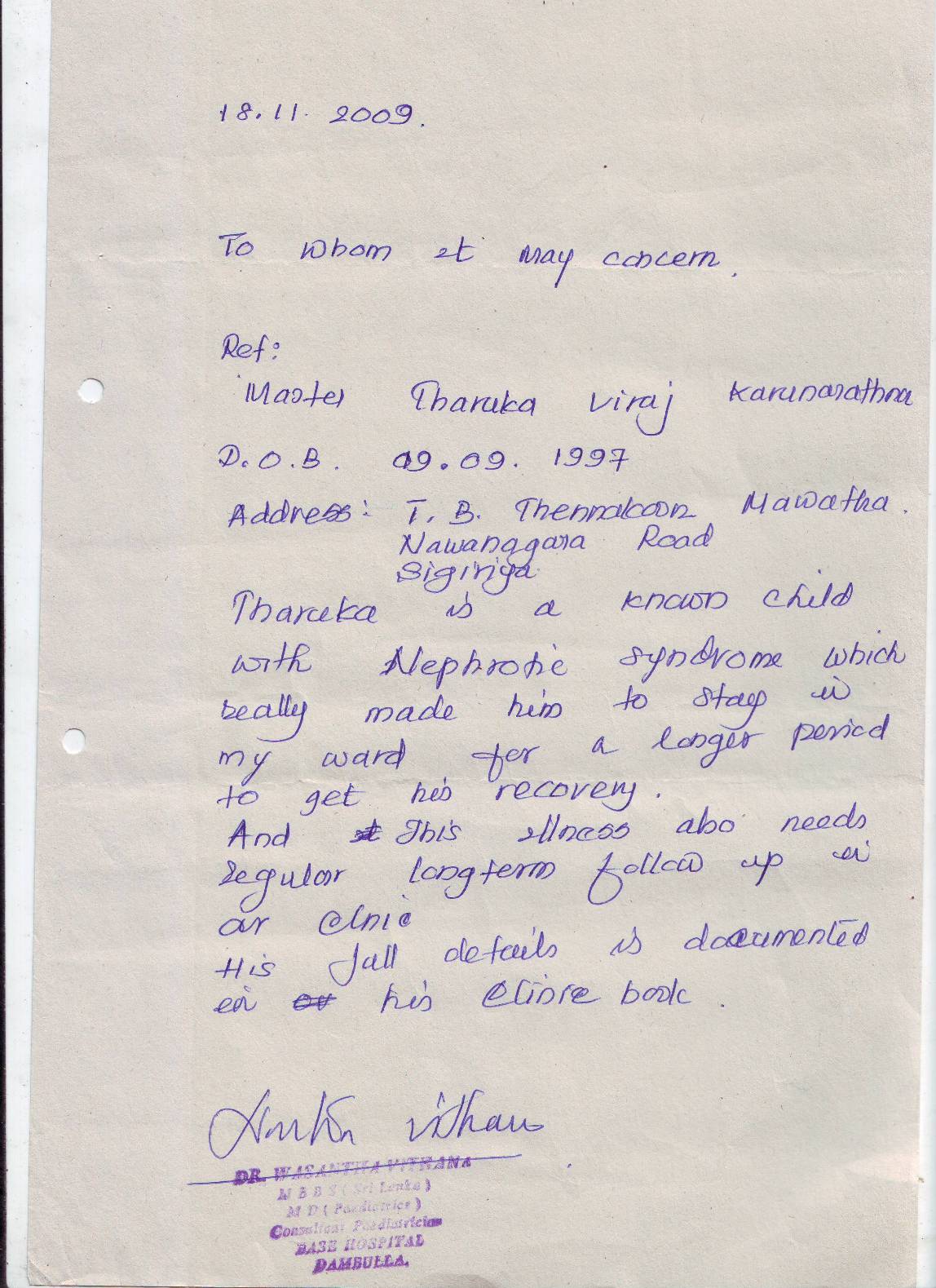 Kidney patient needing long term treatment, for about 5 years. (at least until 2014) At times requires to be hospitalized for long periods. Child misses school for long periods and during such times, mother needs to arrange private tuition lessons to cover for the missed lessons. Need financial assistance as the family is finding it very hard to bear the medical and other added expenses. Average monthly medical expenses are about Rs. 7,500.00. Details of the expenses are given below; Transport to Kandy and back 5,400.00 (Doctors have advised to protect child from crowded buses. Therefore mother needs to take child in a 3 wheeler from Sigiriya to Kandy about twice every month, each trip costing 2,700.00. Blood and urine tests 2,000.00 (On average one test is done every month). After having discussed with the mother we were informed that the current financial burden on the family could be eased if she could get a monthly donation of 4,500.00 [Updated on 10.Jul.2010] Target amount was raised. Two donors have pledged to remit 4,500.00 monthly via Ranaviru Seva Authority to child's mother's account.